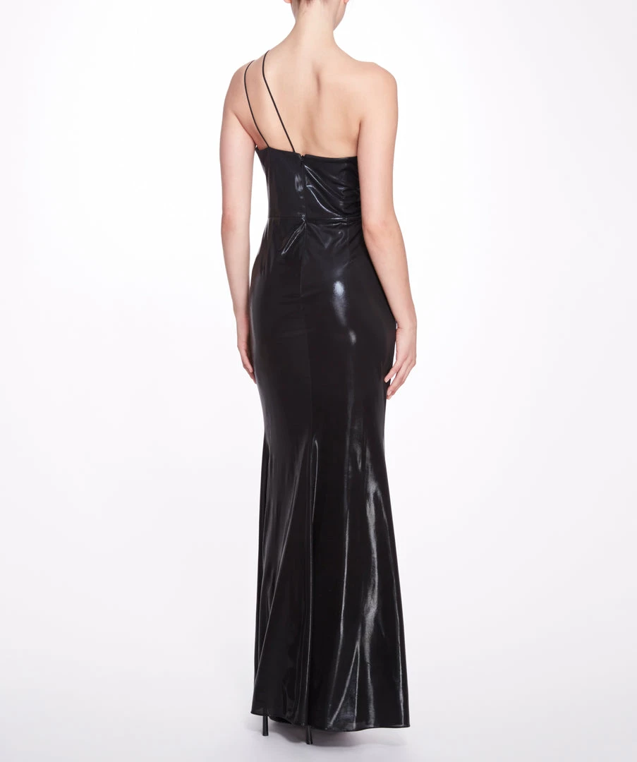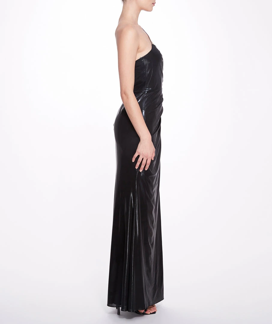 Sleeveless ruched lamé gown with asymmetrical strap detailing