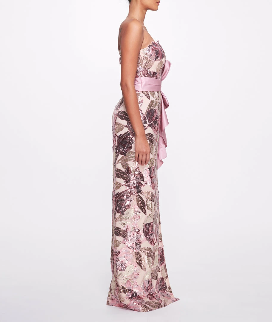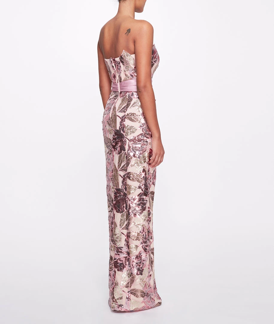 Strapless sequined cutwork gown with front side slit and mikado draped waistband