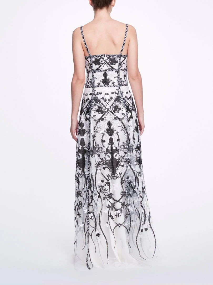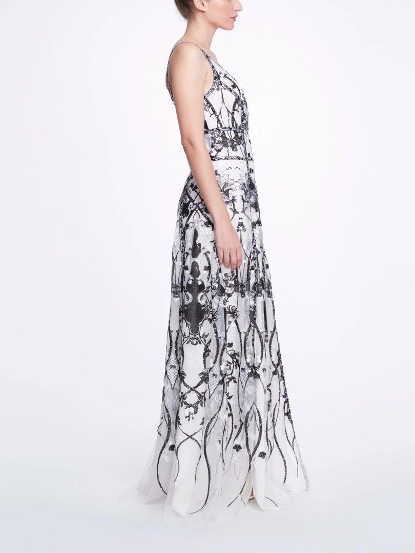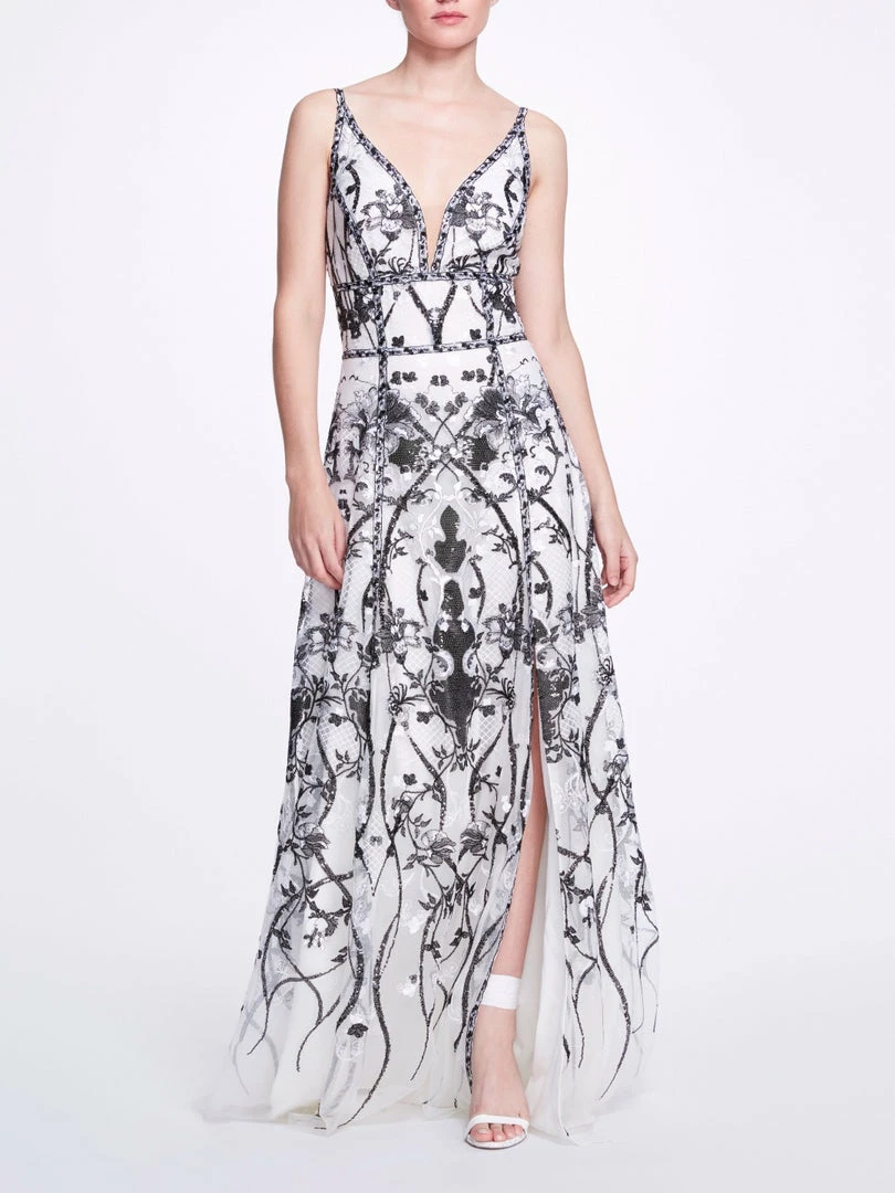 Sleeveless v-neck sequin embroidered tulle gown with front side slits and adjustable straps