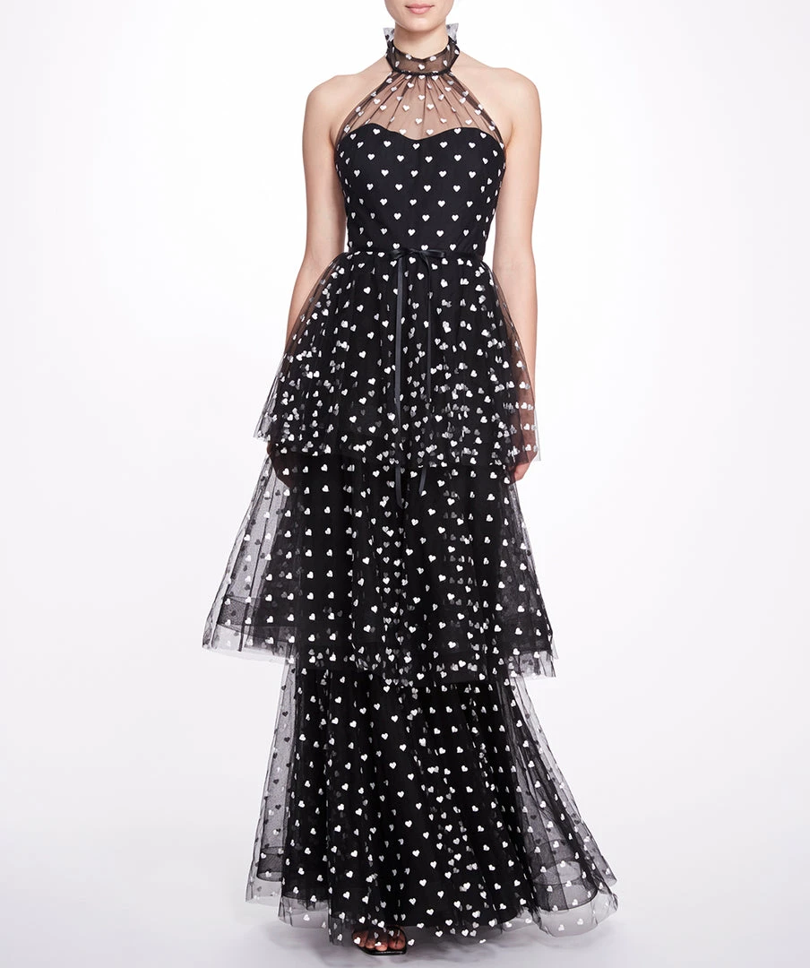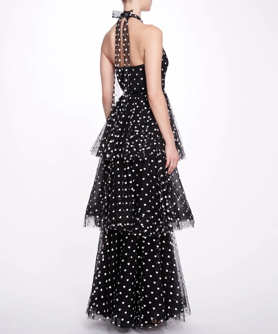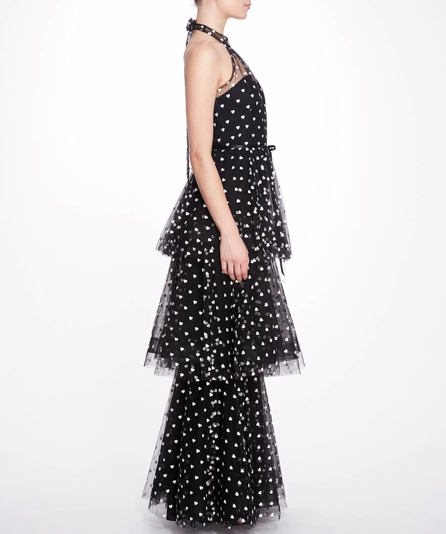 Sleeveless printed tulle 3-tier halter cocktail with sweetheart neckline and waistband