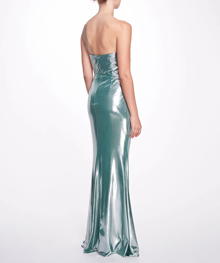 Sleeveless ruched lamé gown with asymmetrical strap detailing