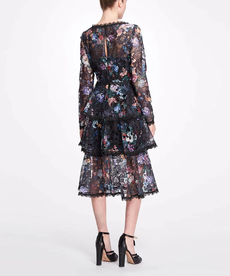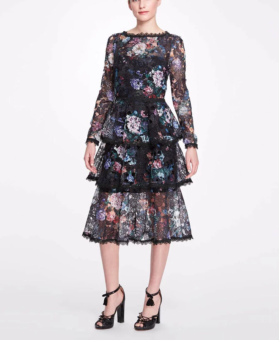 Black long sleeve, 3 tiered floral printed guipure lace dress.