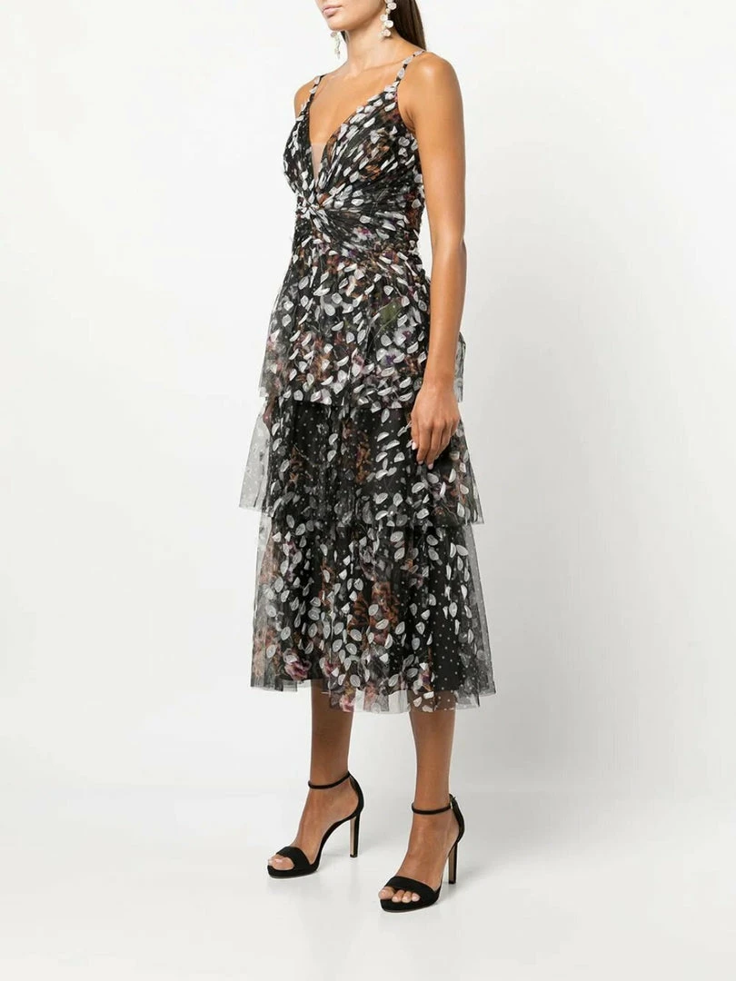 Deep v neck tiered gown with floral detailing, layered bodice and cami straps