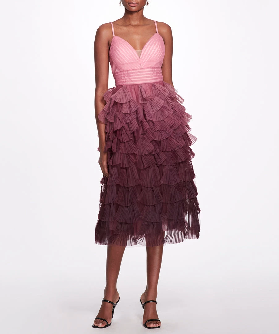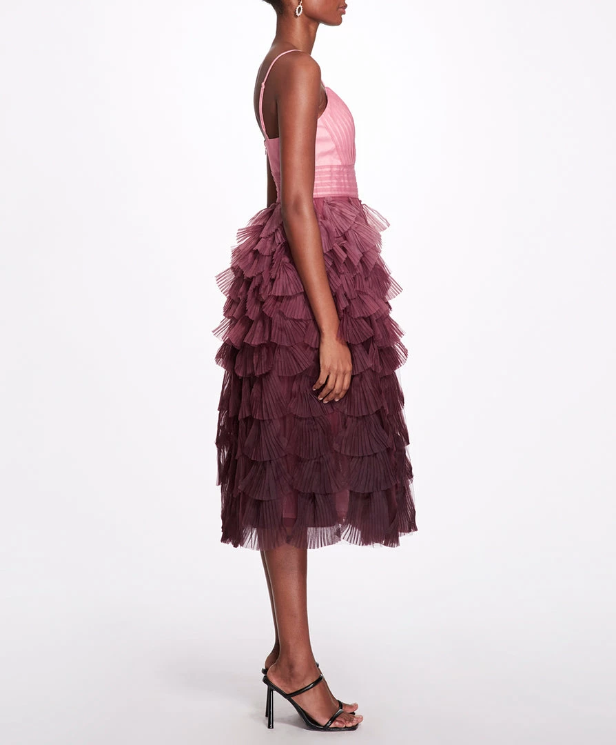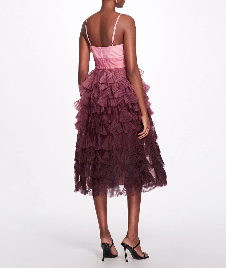 Rose, multicolor gown featuring a tiered ombre bodice and fitted waist.
