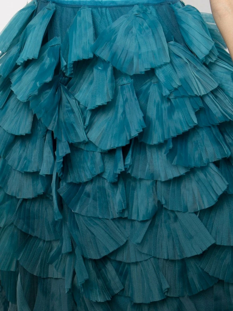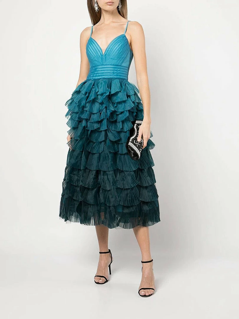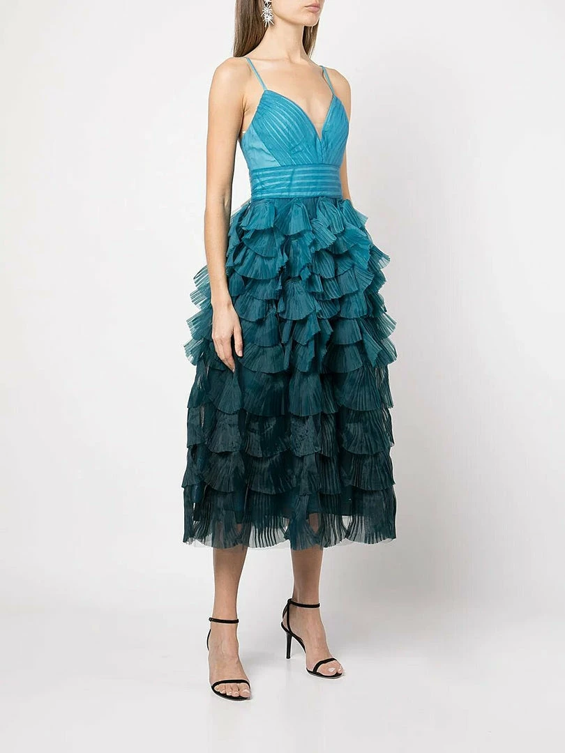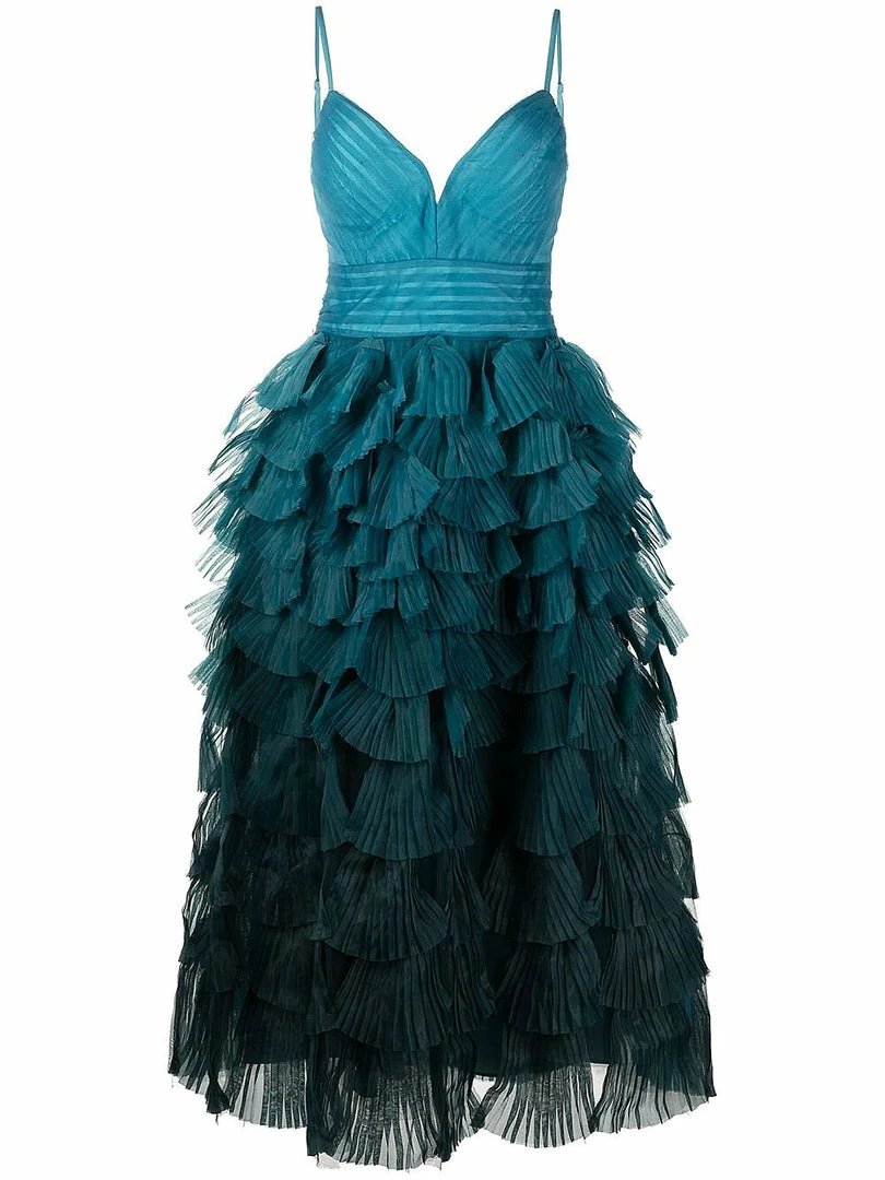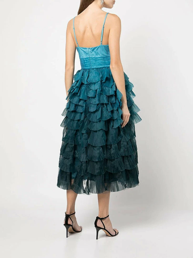 Teal, multicolor gown featuring a tiered ombre bodice and fitted waist.