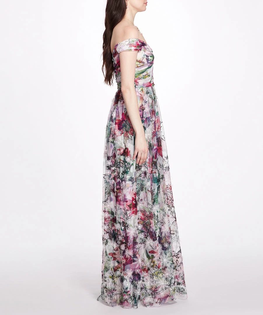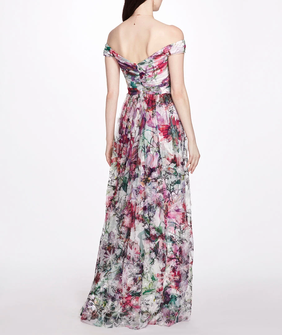 Off the shoulder printed tulle a-line gown with draped bodice, satin bow waistband, and 3D floral appliqués