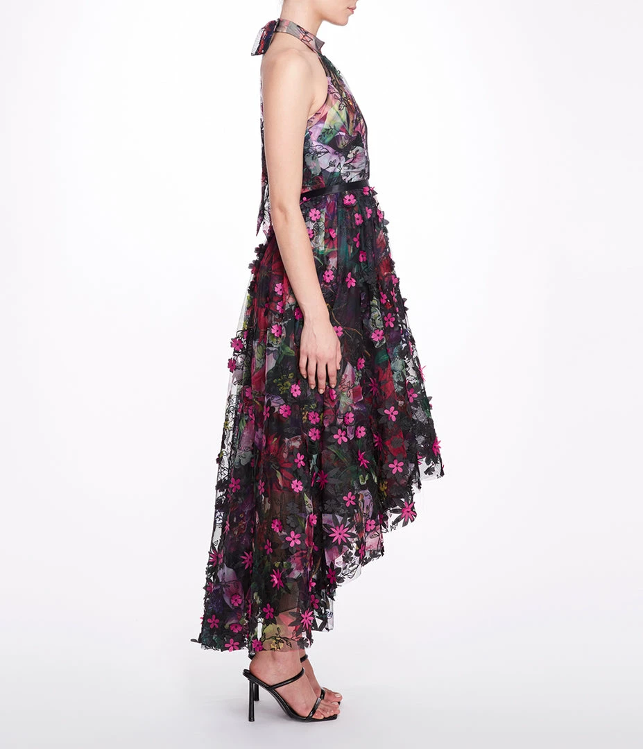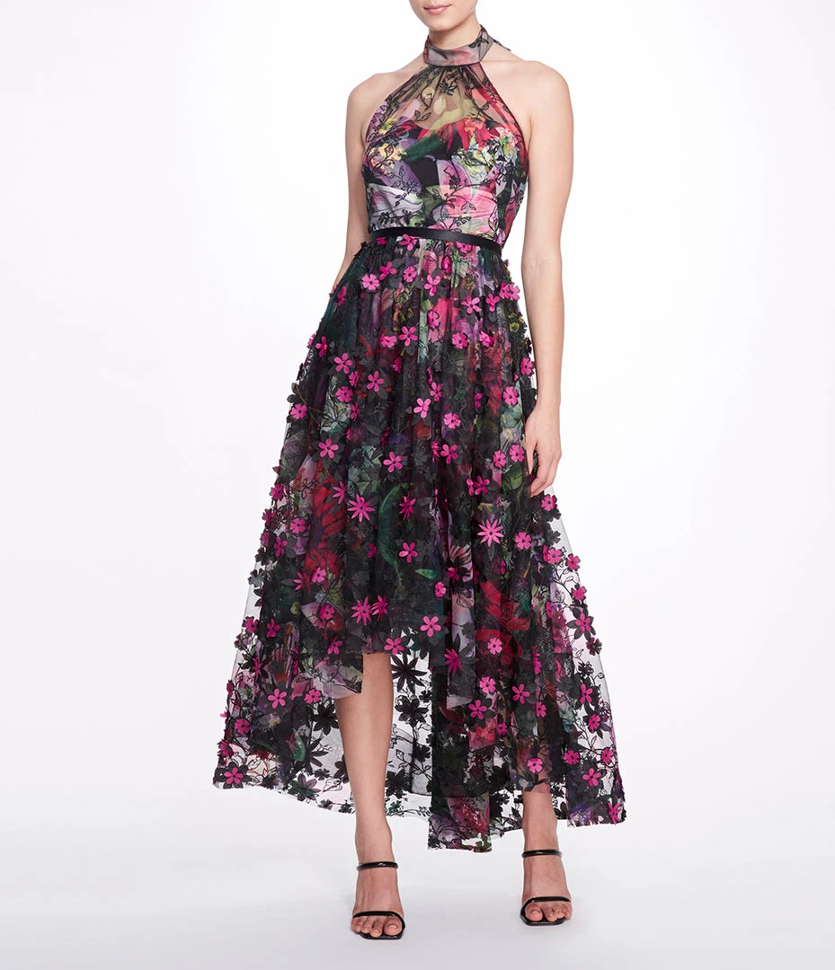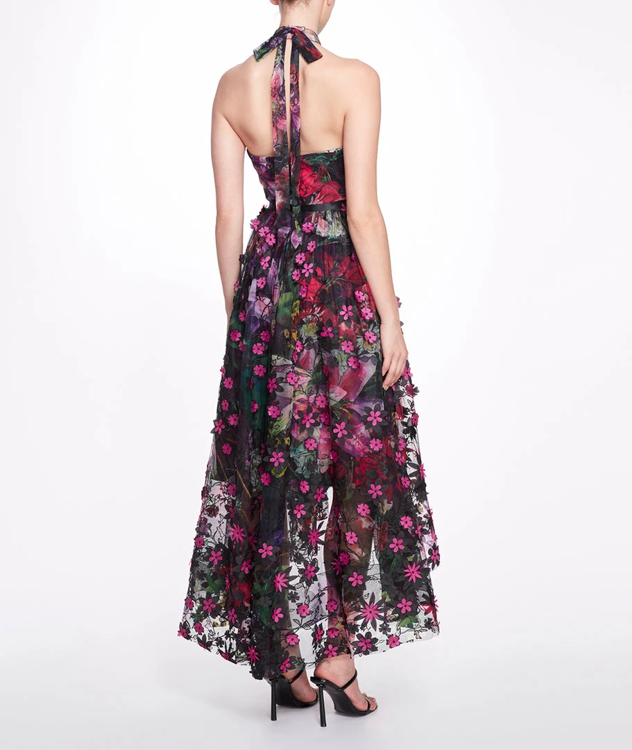 Sleeveless printed tulle halter hi-lo gown with floral appliqués and waistband