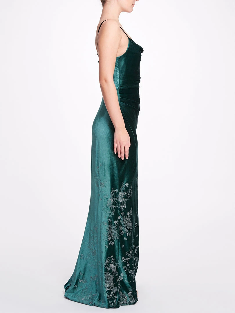 Sleeveless cami strap gown with cowl neck, front leg slit and floral embroidery.