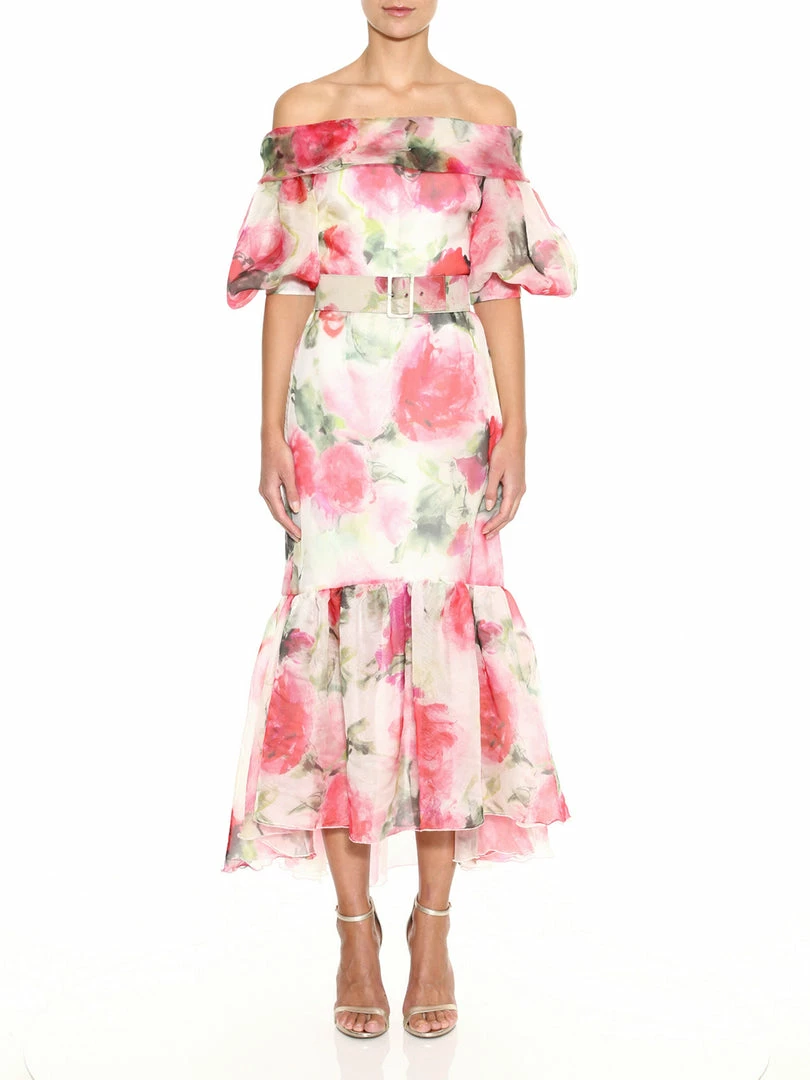 Bloom all year round in this Off-the-Shoulder Cocktail Dress in rose. Featuring an enchanting all over floral print, an elegant off-the shoulder design with charming 3/4 balloon sleeves and a flattering fit-to-flare silhouette with a light ruffled hem.